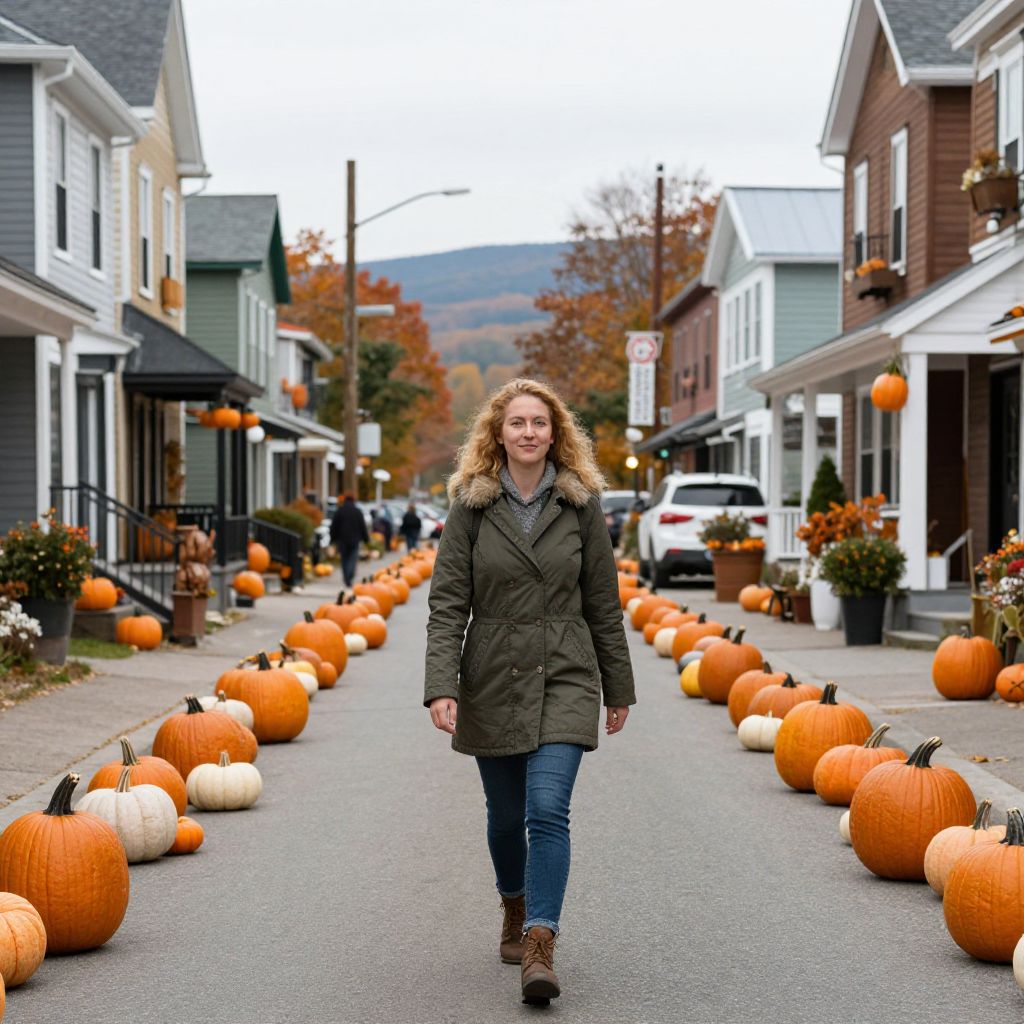 Woman walking down street in Woodstock, Vermont that is decorated with pumpkins for Halloween