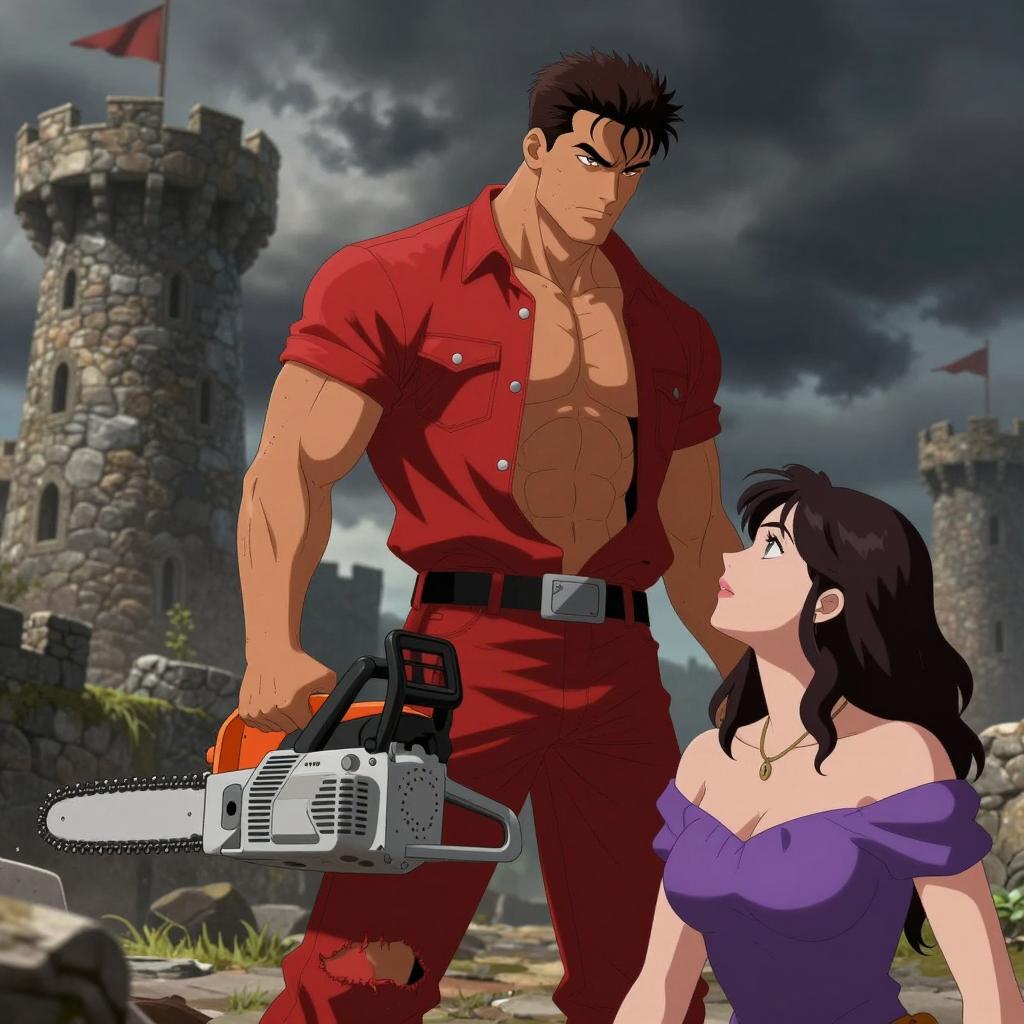 Illustration of a muscular man in a white tank top with a red heart, holding a gun, standing in front of a woman in a red dress. A large, menacing monster with glowing eyes and claws looms behind them. They stand in a misty, neon-lit urban setting with buildings and people in the background. The man has short brown hair and a serious expression. The woman has long dark hair and a neutral expression. Several other people are visible in the background, some running. The monster has a black, skeletal face and wears a headdress.
