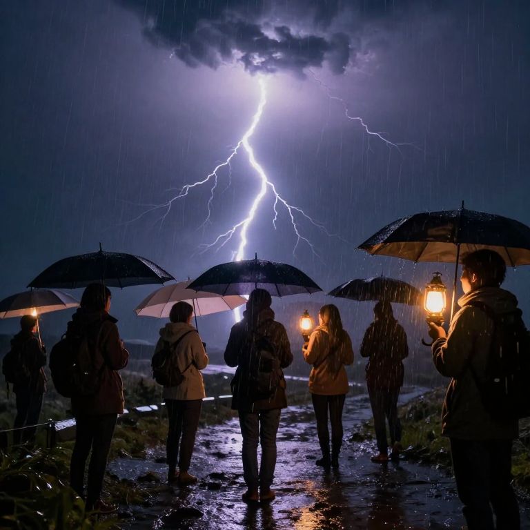 Amidst the tempestuous embrace of storm and rain, seekers armed with umbrellas and lanterns stand as silent witnesses to the raw power of nature, their souls illuminated by the fleeting glow of captured lightning—a testament to humanity’s enduring quest for light in the face of chaos.
