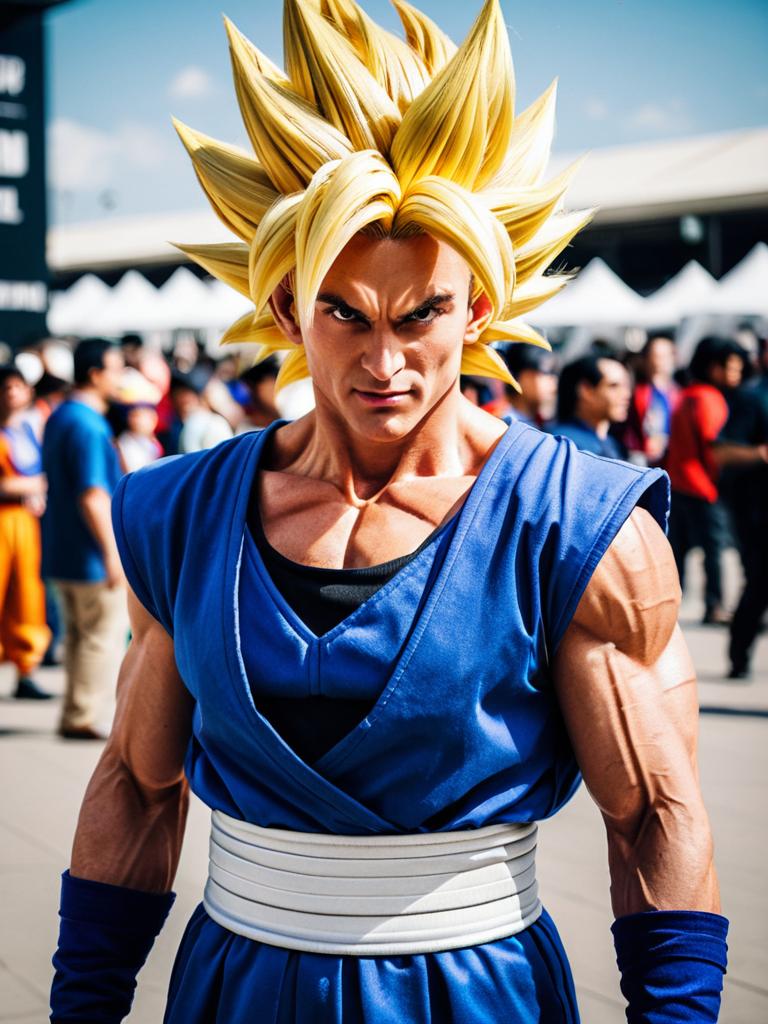 Man in Dragon Ball Super Saiyan costume, cosplay festival portrait, realistic look