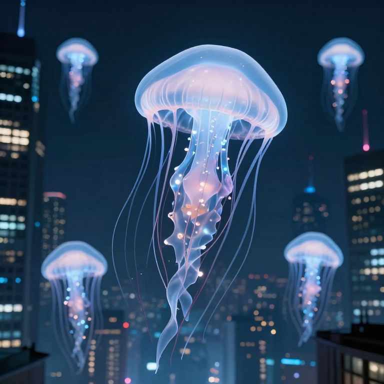 Gigantic translucent jellyfish gracefully drift between towering skyscrapers, their bell chambers housing miniature floating cities illuminated by bioluminescent lights that cast a serene glow over the nightless metropolis below.