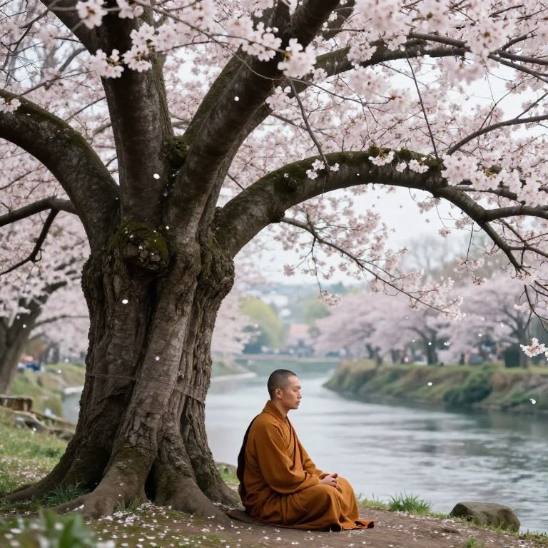 Devotion portrayed by a solitary monk meditating under a giant ancient tree, enveloped in a peaceful aura with falling cherry blossoms and a tranquil river in the background, emphasizing inner peace and unwavering dedication.