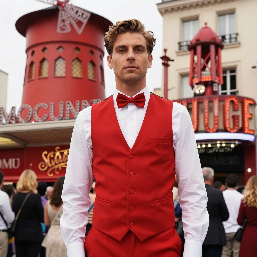 A Caucasian man wearing a red vest and matching red bow tie over a white shirt with rolled-up sleeves, standing in front of the Moulin Rouge cabaret in Paris, France. The iconic red windmill and illuminated signage are visible in the background, with a crowd of people gathered around.