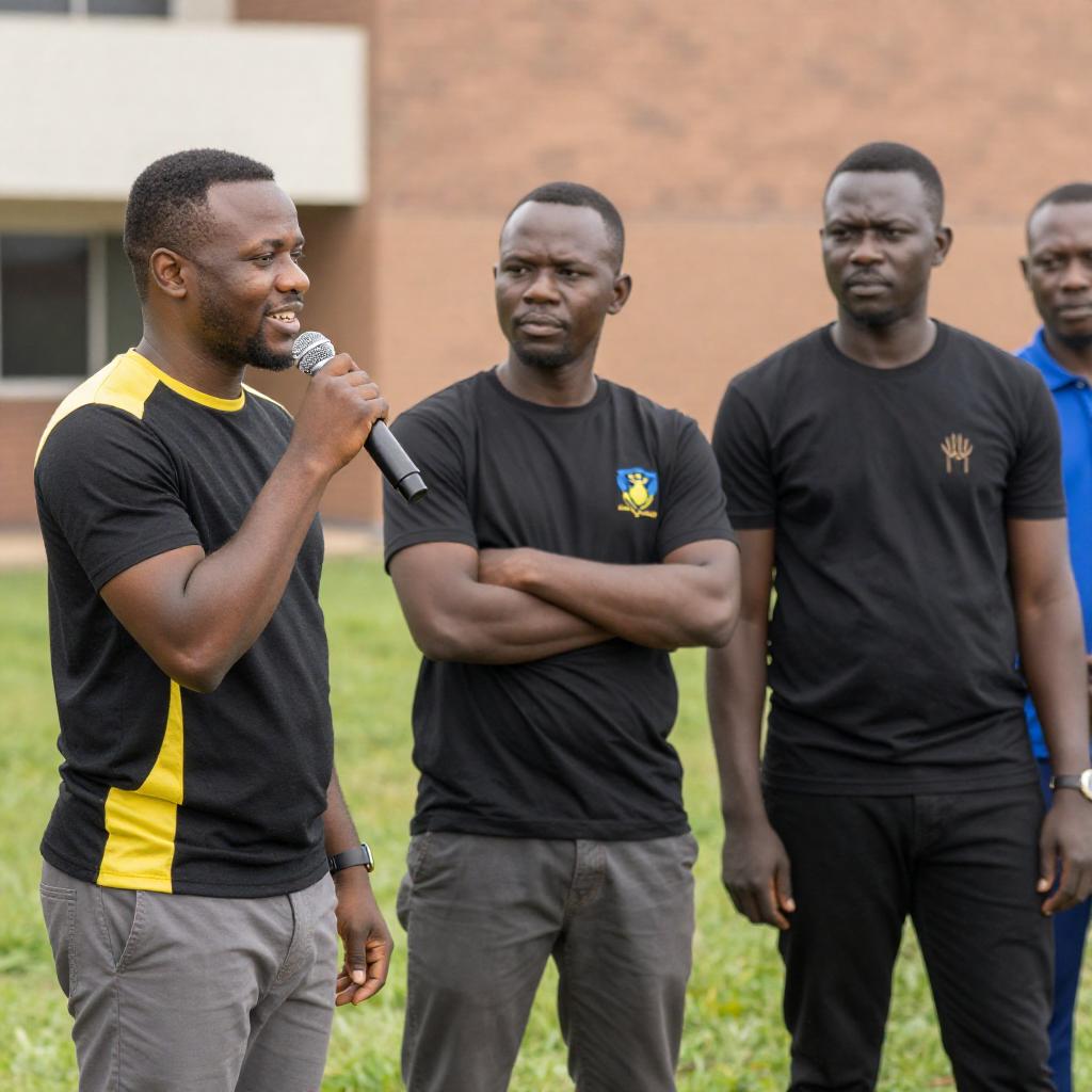 Photograph of four African-American men outdoors on a sunny day. Three men in white shirts and one in a black shirt stand in a circle, discussing. The man in white on the right holds a drum, while the man in black wears sunglasses. Background includes a blurred green field and trees.