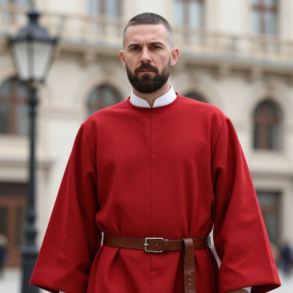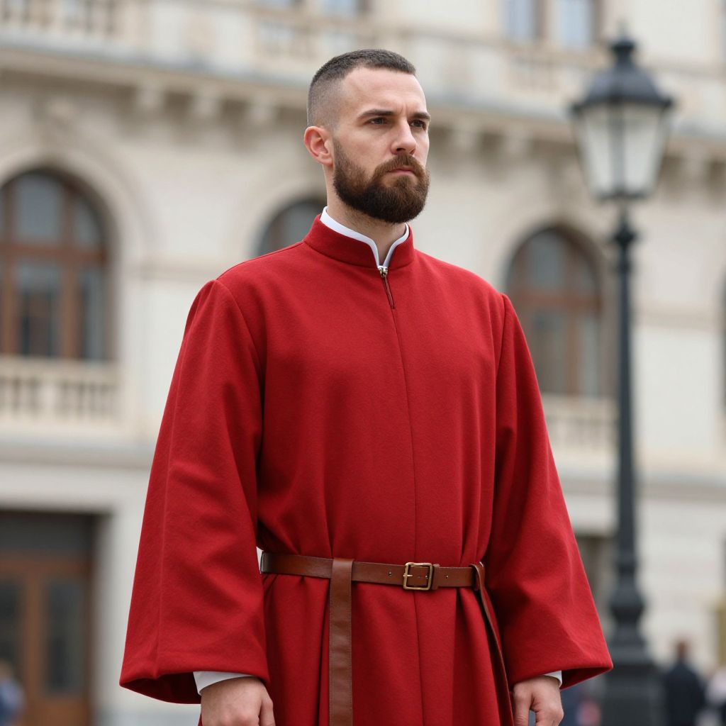 Photograph of a serious-looking man with a short beard and buzz cut, standing in front of a blurred, classical building with arched windows and a black streetlamp. He's wearing a vibrant red, long-sleeved robe with a brown leather belt, and a white shirt peeks out at the collar. The lighting is natural, highlighting the rich color of his robe.