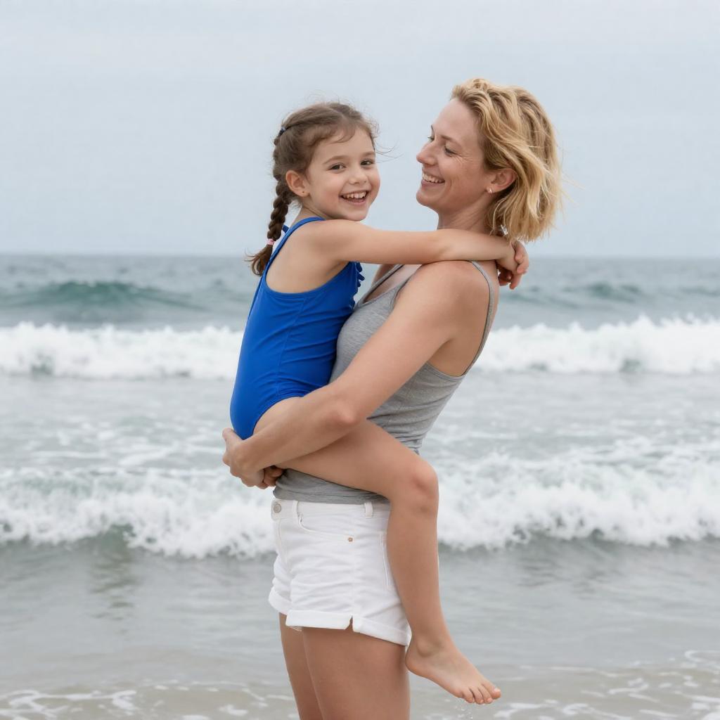 Photograph of a man and a young boy fishing in the ocean. Man is shirtless, wearing brown and green striped swim trunks, bending slightly, holding boy's shoulder. Boy has curly brown hair, wearing gray shirt and red shorts, holding fishing rod. Ocean waves in background. Man and boy looking at fishing rod.