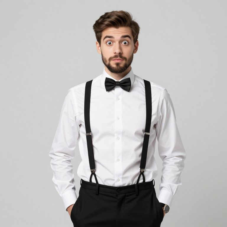 Photograph of a young, cute guy with short brown hair and a neatly trimmed beard. He's wearing a white dress shirt, black bow tie, and black suspenders over black pants with his hands in his pockets. He has a surprised expression with wide eyes and slightly raised eyebrows. The background is a plain, light gray. His overall look is formal yet playful.