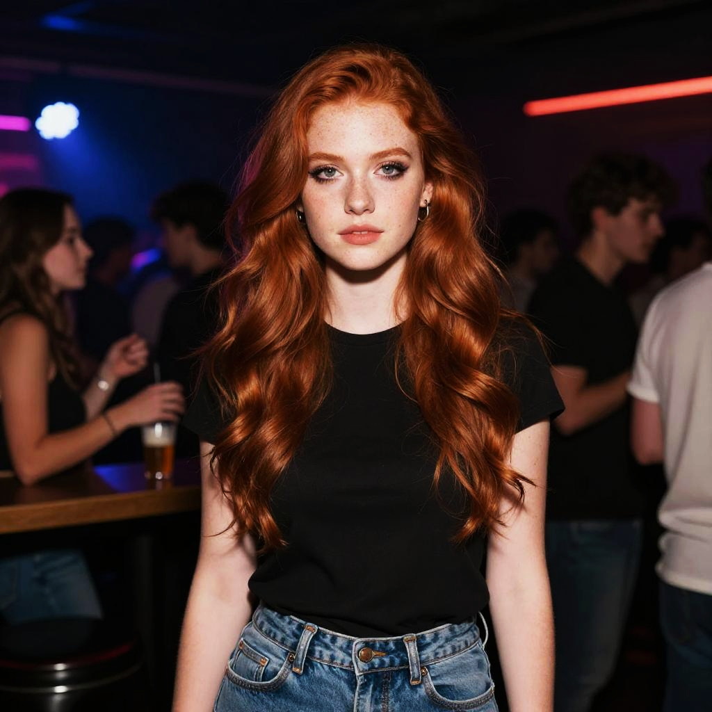Photograph of a young woman with long, wavy red hair and fair skin, wearing a black short-sleeved top and high-waisted blue jeans. She has prominent freckles across her cheeks and nose, and is standing in a dimly lit nightclub with colorful LED lights in the background. Her expression is neutral, and she is slightly illuminated by the lights. Other club-goers, blurred in the background, are seated at a bar and conversing. The overall atmosphere is vibrant and energetic.