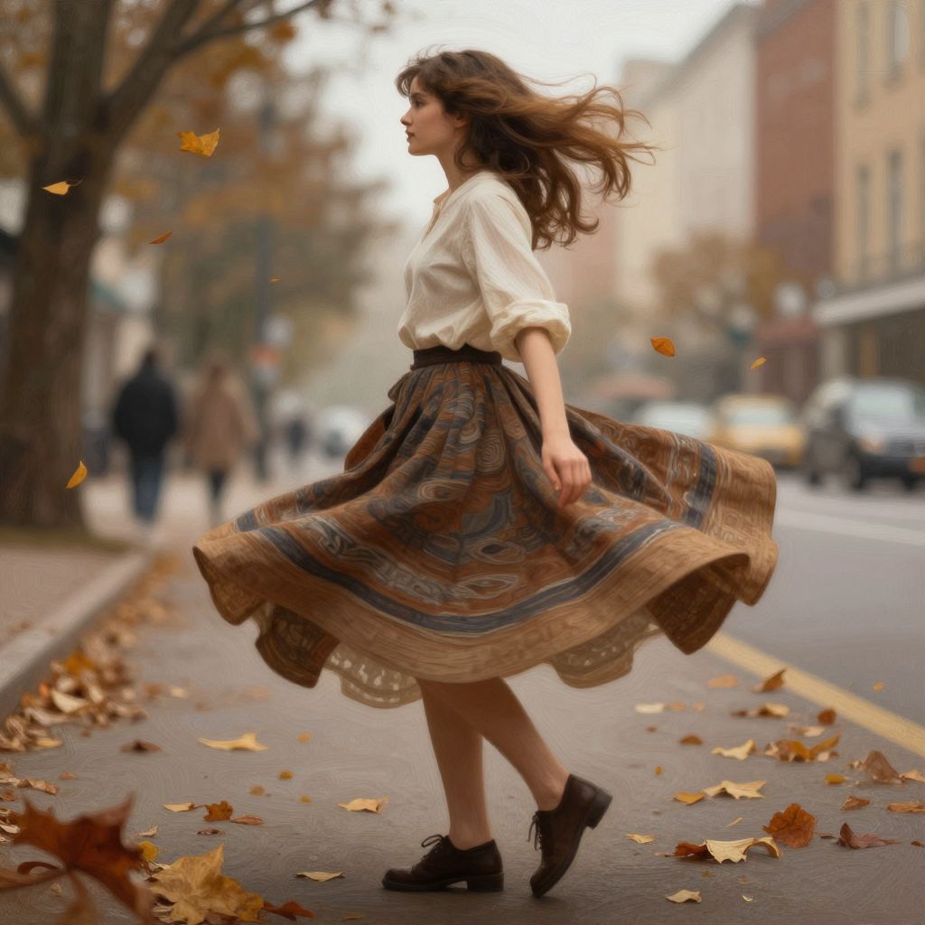 Windy skirt art portraying a young woman in mid-motion, her skirt lifted by the wind, surrounded by swirling autumn leaves, rich textures and warm tones, painterly brushstrokes emphasizing movement and grace in an outdoor cityscape