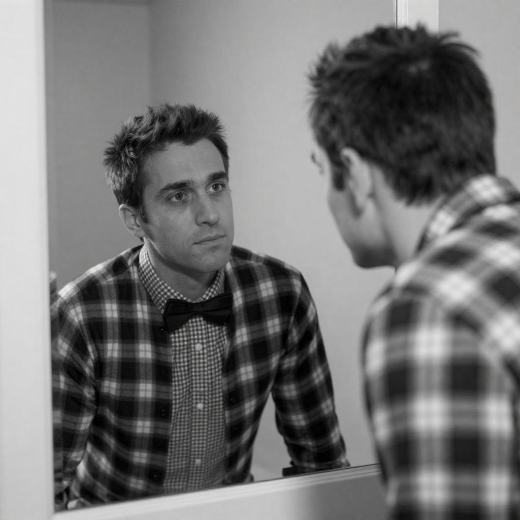 Black-and-white photograph of a man with short dark hair, wearing a plaid shirt, leaning close to a mirror. He gazes intently at his reflection, which shows him in a bow tie and checkered shirt. The mirror is slightly tilted, creating a sense of depth. The man's expression is serious and focused.