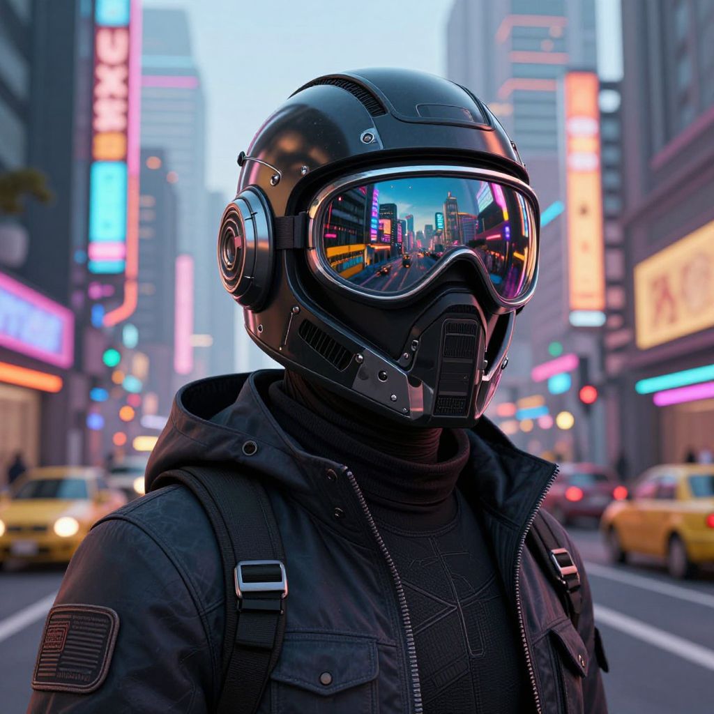 In this captivating image, a futuristic man dons a sleek, reflective helmet that mirrors the vibrant cityscape behind him. The helmet, a blend of black and metallic hues, is adorned with intricate details and a pair of large, circular goggles that add to its high-tech appearance. The man's attire is a dark, form-fitting jacket with patches and a hood, suggesting a readiness for action or a mission. The cityscape in the background is a bustling metropolis, with tall buildings adorned with neon signs and lights that cast a warm glow over the scene. The streets are lined with cars and pedestrians, all contributing to the lively atmosphere. The overall composition, with the man positioned in the foreground and the cityscape in the background, creates a sense of depth and immersion in this cyberpunk realism setting. The image is rendered in a cartoon-realism style, with exaggerated features and vibrant colors that enhance the futuristic and dynamic feel of the scene.