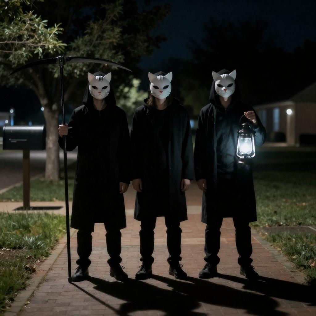 Three people in dark clothing and cat masks stand on a brick sidewalk at night. One holds a scythe, another a lantern. Background: dark trees, grass, and a mailbox. Lit from below, shadows create a spooky atmosphere.