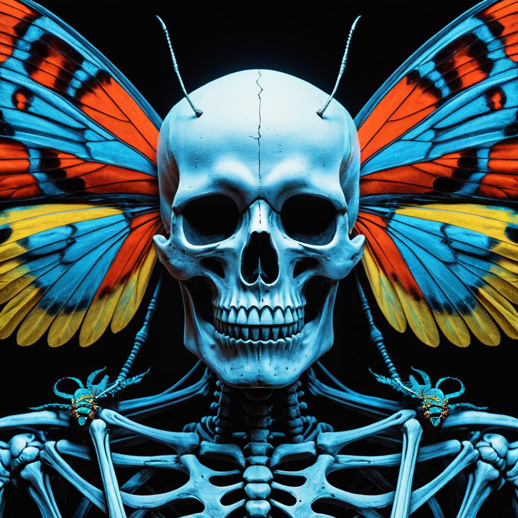 A portrait of a skelton with moth wings, highly detailed, digital photo, hdri, by christopher bretz and john carpenter, vivid colors, high contrast, 8 k resolution, intricate, photorealistic, smooth, psychedelic color scheme, concept art, award winning, cg society contest winner