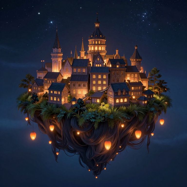 This digital illustration depicts a magical floating island castle at night. The island is covered with lush greenery and illuminated by warm, glowing lanterns hanging from twisted roots at the base. The castle features multiple turrets, spires, and windows, all warmly lit from within. The sky above is a deep blue, dotted with stars, adding to the enchanting atmosphere. The island's architecture includes a central tall tower and several smaller, connected buildings, all with dark, textured roofs. The overall scene exudes a whimsical, fairy-tale-like charm, blending elements of fantasy and realism.