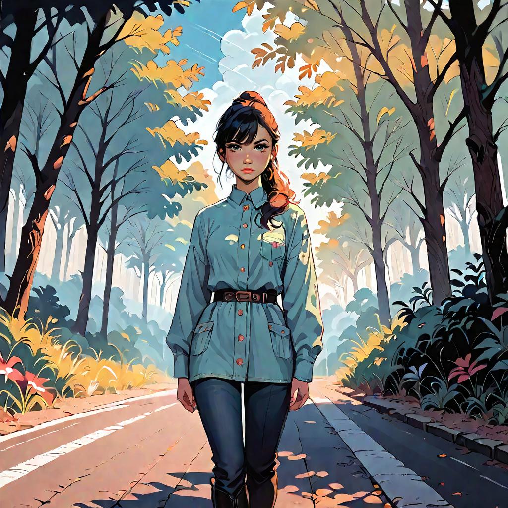 Masterpiece, best quality, highly detailed, score_9, score_8_up, score_7_up, score_6_up, source_Anime, half body shot, road, tree, nature, outdoors, forest, sunlight, day, signature, path, ground vehicle, sky