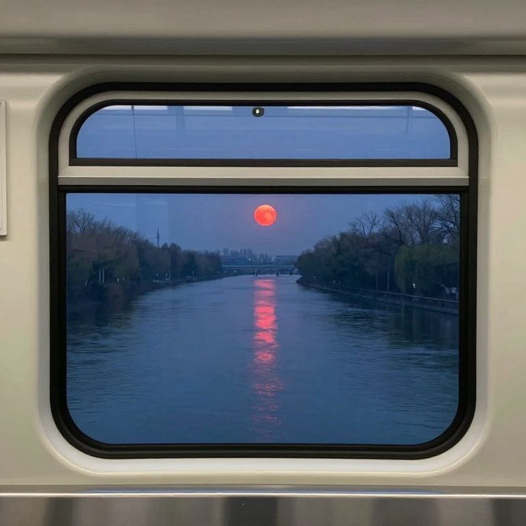 The image depicts a scene viewed from the inside of a subway train, with no other passengers visible. The train's windows reveal a striking contrast between the vibrant red moon and the serene river outside. The moon, a glowing orb of red, is positioned centrally in the window, casting a warm glow that reflects off the water below. The river, calm and reflective, stretches out into the distance, flanked by trees with bare branches that suggest a winter or early spring setting. The train itself is modern, with sleek, rounded windows and a sleek, metallic exterior. The overall composition is balanced, with the red moon and the river creating a harmonious visual rhythm that draws the viewer's eye across the scene. The interplay of colors—cool blues and greens of the natural landscape, the bold red of the moon, and the metallic sheen of the train—creates a striking and memorable image.