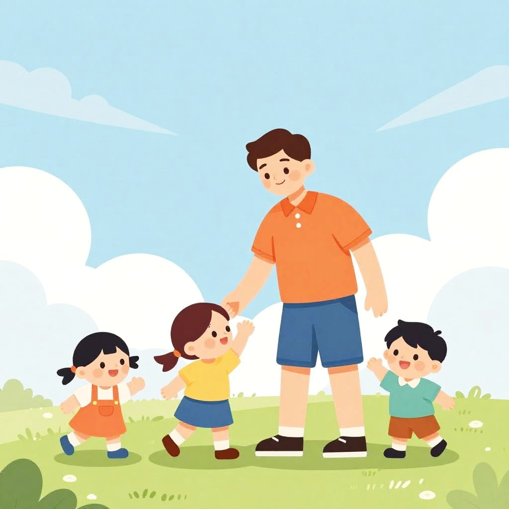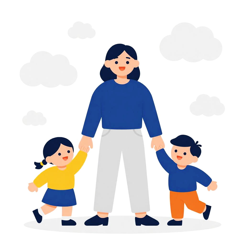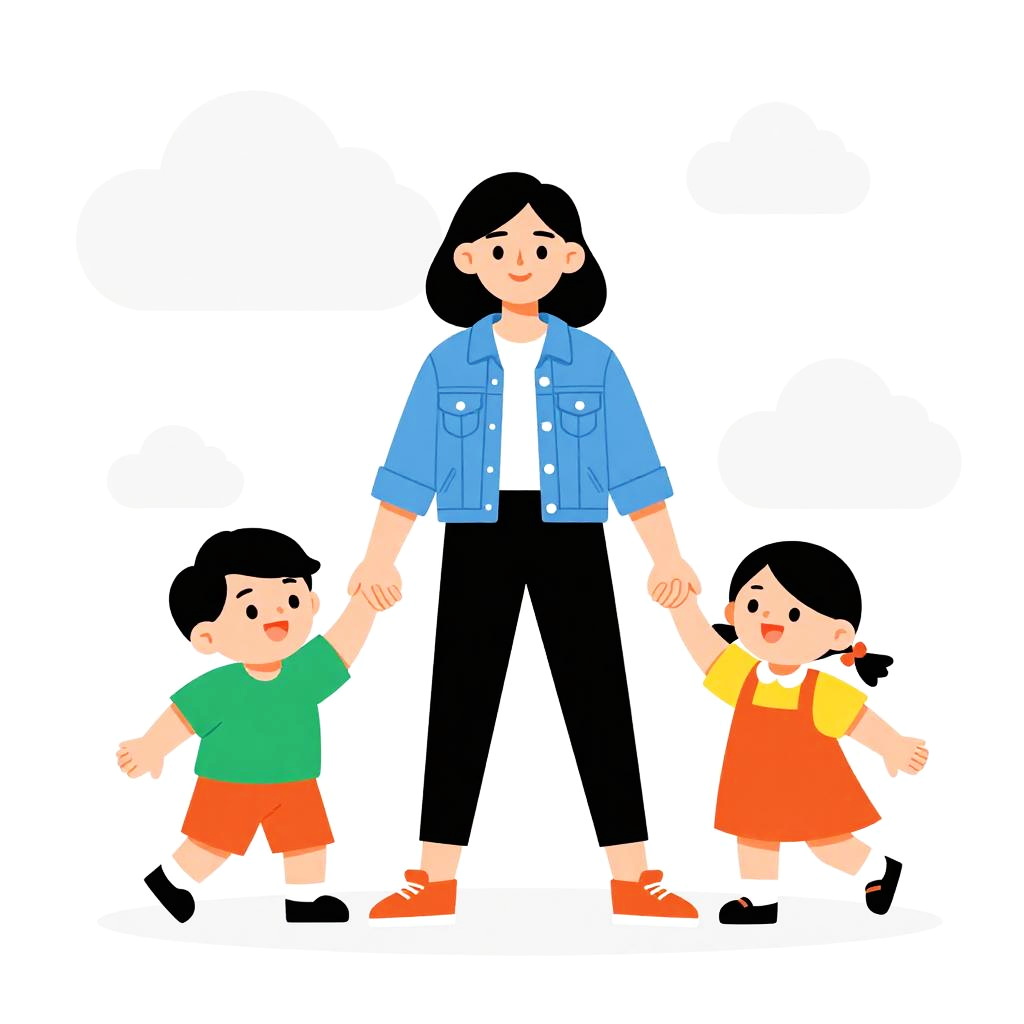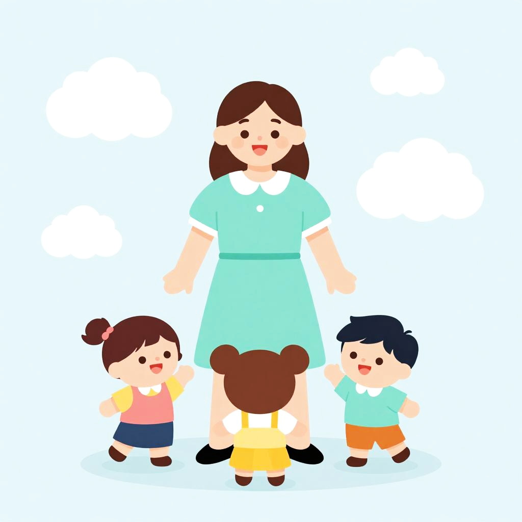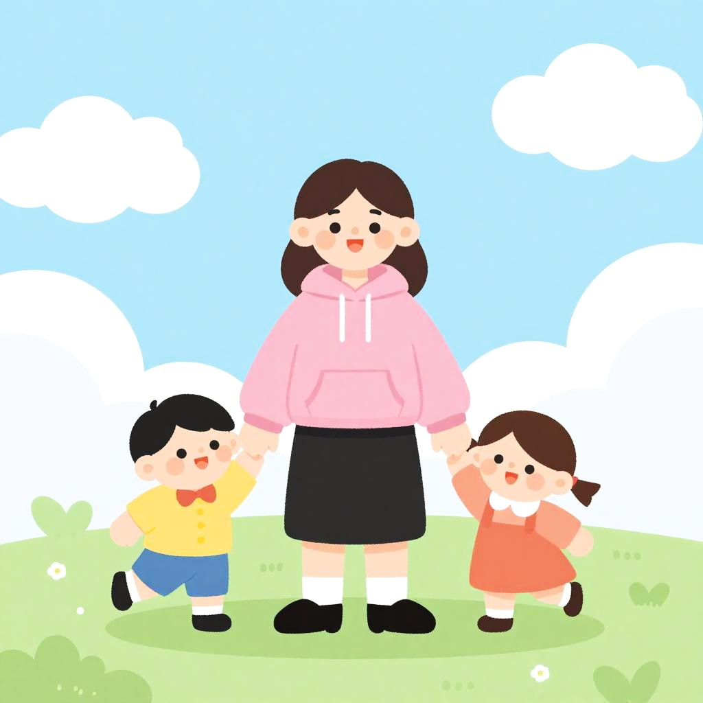 2D flat art of a sister in a red hoodie and denim shorts with three children around her playing, vector art, sunny day, cute cover art with bright colors and a playful, happy mood.