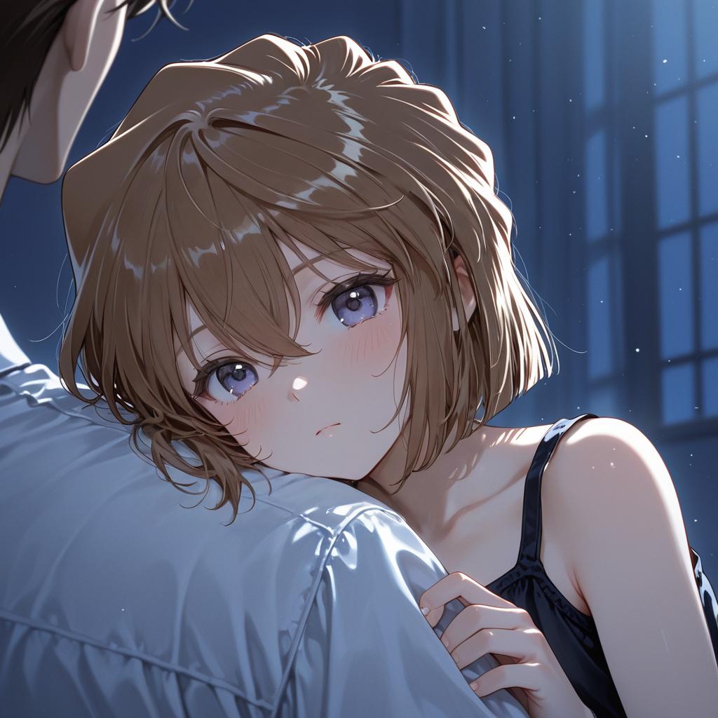 Hanasato minori, project sekai, 1girl, hair behind ear, grey eyes, eyelashes, brown hair, medium hair, long hair, swept bangs, braid, white shirt, dot nose, tareme, by artist sakieko, dark_illustrious