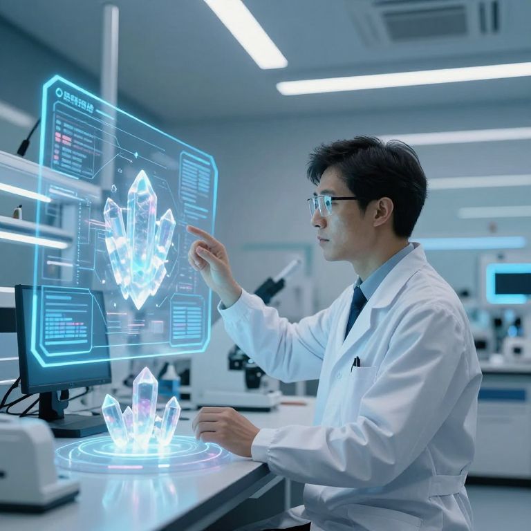 Eniu, a high-tech laboratory filled with advanced holographic interfaces, a scientist examining luminescent crystals suspended in mid-air, sleek futuristic design with cool blue and white tones, clean lines and dynamic composition conveying innovation and discovery.