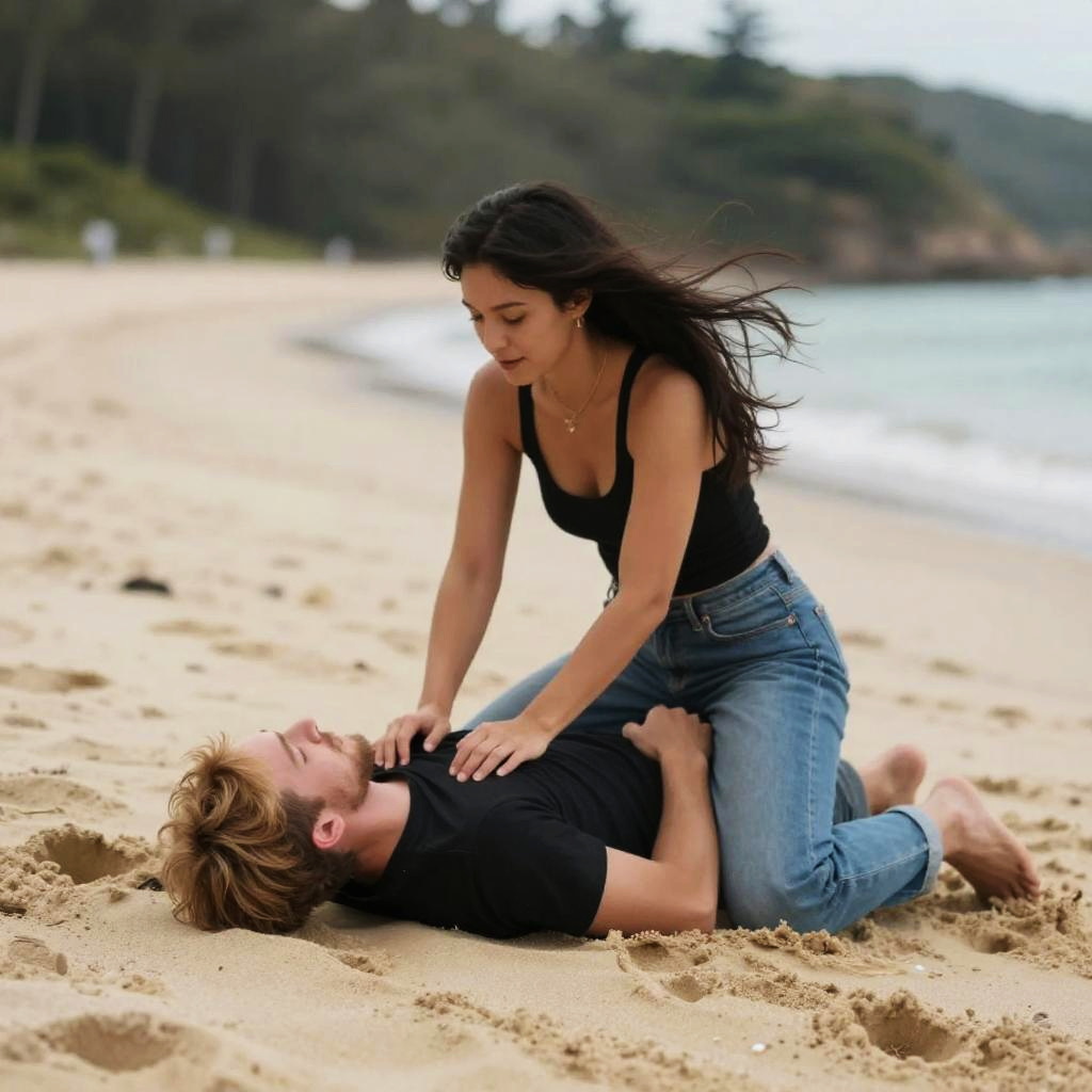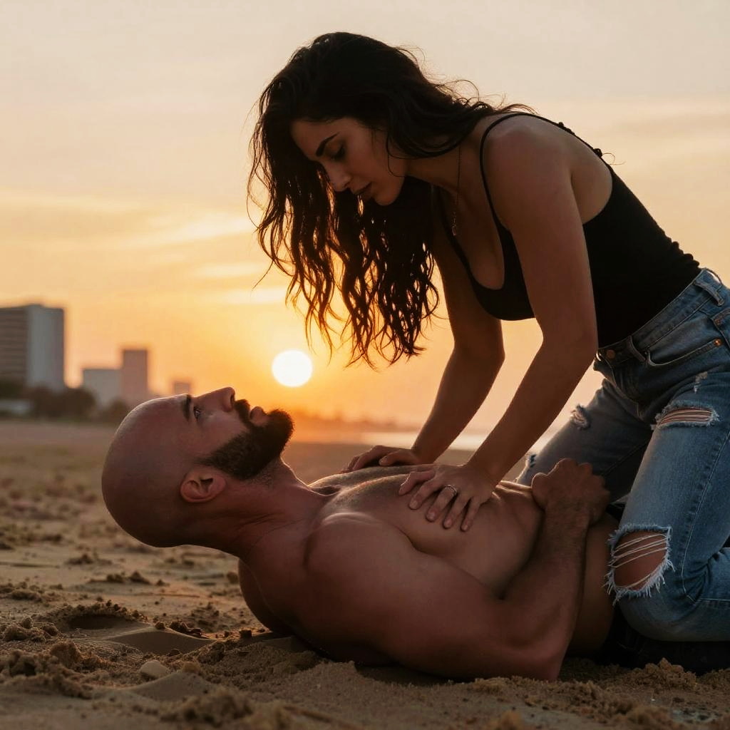 Photograph of a passionate moment at sunset. A muscular, bald man with a beard lies on sandy ground, looking up at a woman with long, dark hair. She's wearing a black tank top and ripped jeans, leaning over him with her hands on his chest. The background shows a glowing orange sunset and a blurred cityscape. The mood is intense and romantic.