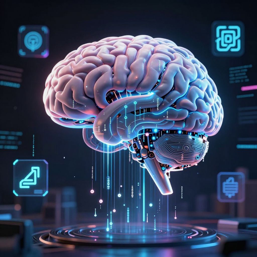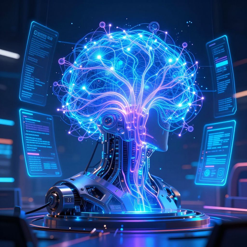 Open AI generator concept art, futuristic AI machine with glowing neural networks, digital circuits, and holographic interface, vibrant blue and purple tones, cyberpunk style, ultra-detailed sci-fi scene, advanced technology environment, sleek metallic textures