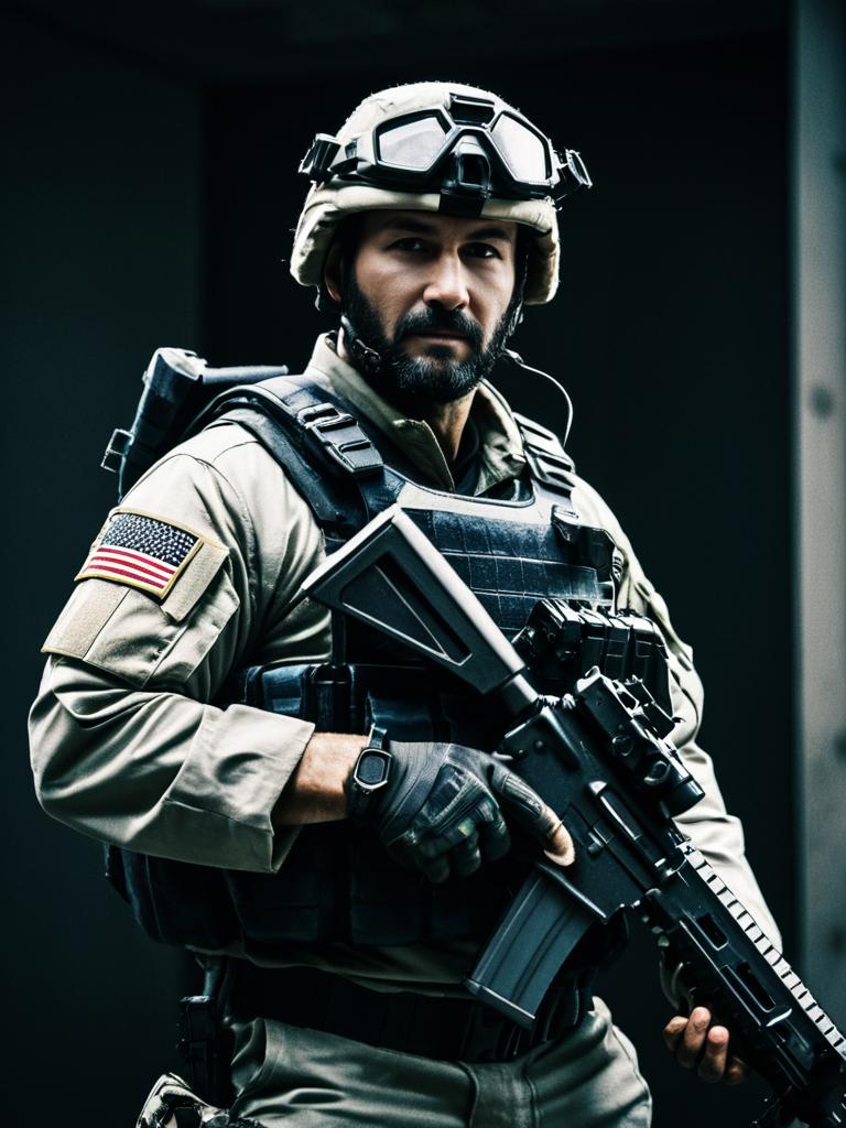 Man in Seal Team Six Raid costume, photorealistic cosplay portrait, cinematic realism