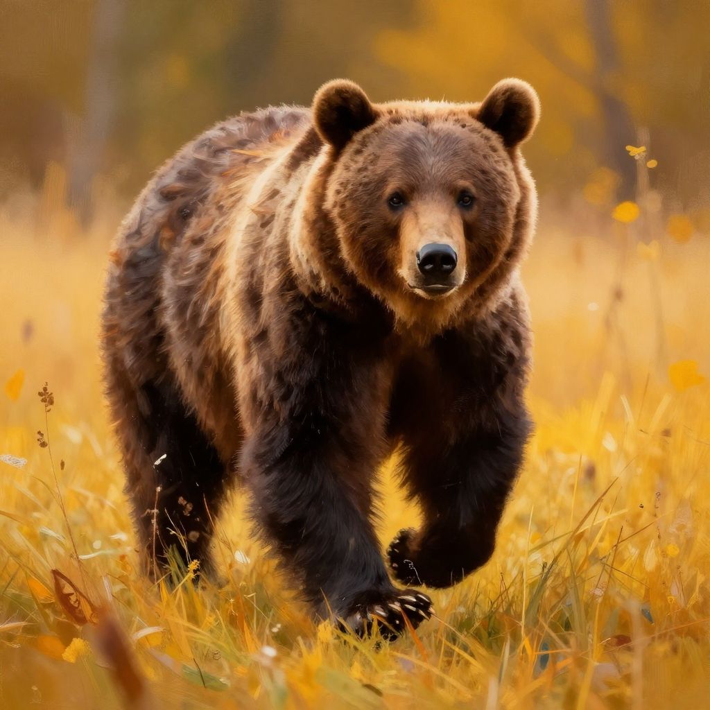 Photograph of a standing brown bear with a thick, shaggy coat, wearing a brown cowboy hat. The bear leans against a rustic wooden fence in a vibrant meadow filled with yellow wildflowers. The background features a stunning sunset with a bright orange sun setting on the horizon, casting a warm glow across the purple and pink sky. The bear gazes to the right, adding a sense of calm and contemplation to the scene. The overall composition is colorful and whimsical, blending natural elements with a touch of humor.