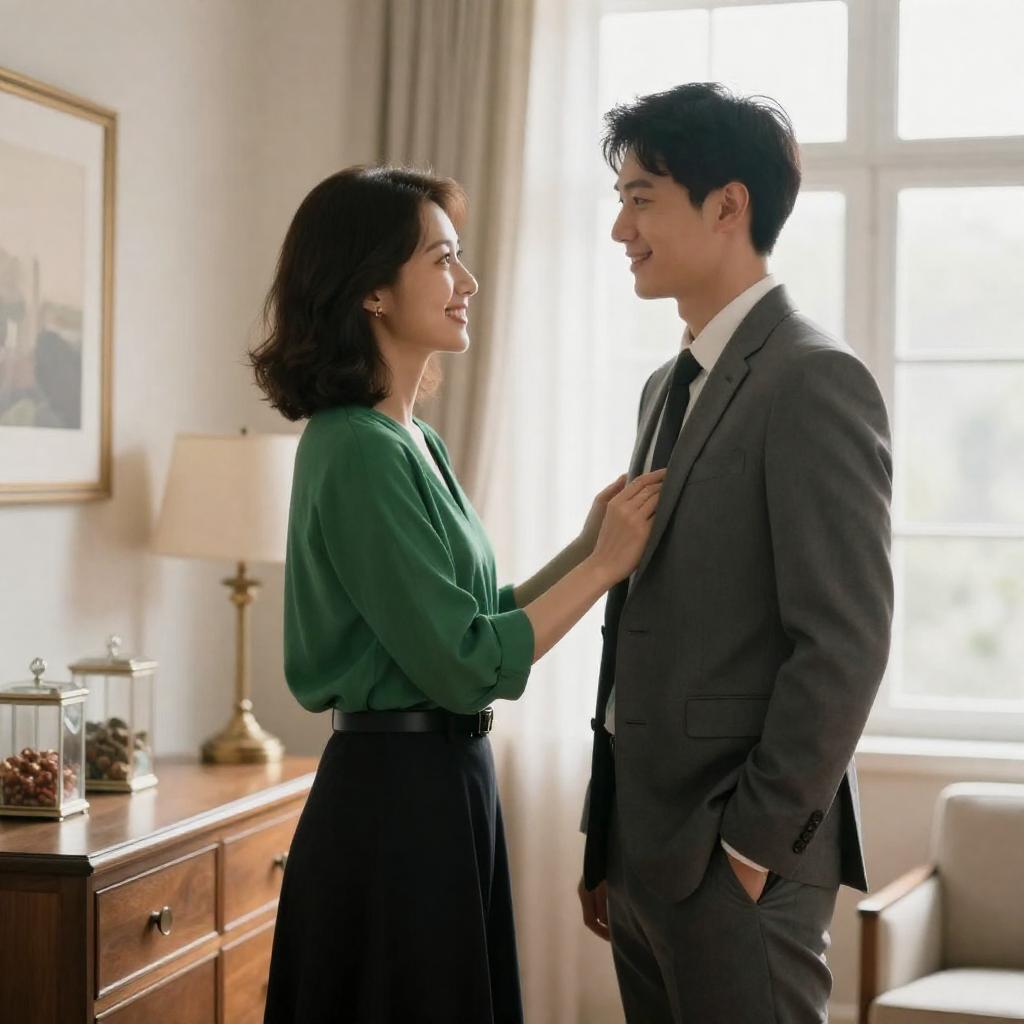 Photograph of a man and woman in an intimate embrace, both smiling at each other. Man in dark coat, woman in beige coat with white headscarf, green backpack strap visible. Background: green tree foliage. Man's short dark hair, woman's black hair partially visible. Both close to each other, eyes closed, smiling. Outdoor setting.
