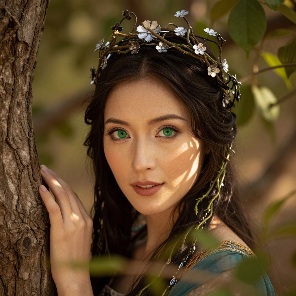A captivating portrait of a Central Asian woman with distant green eyes, her enigmatic gaze fixed upon an unseen point. Adorned in an intricate headdress of intertwined vines and silver flowers, she stands amidst the soft golden light filtering through ancient forest foliage. Leaning against a gnarled tree trunk, her porcelain skin is playfully shadowed by the dense greenery, while her captivating smile exudes both allure and wisdom. This unique perspective, captured from a 'frog's-eye view', reveals intricate details of her delicate features, blending serene Renaissance beauty with contemporary photographic realism.