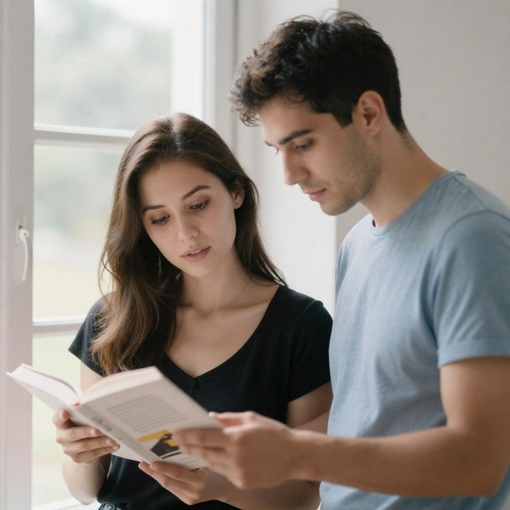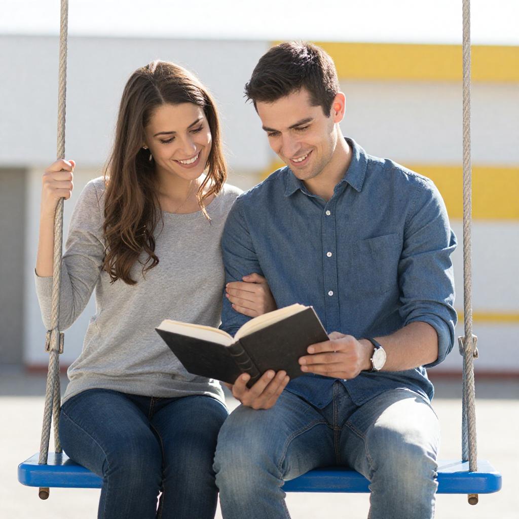 Photograph of a smiling couple sitting on a blue swing in an outdoor setting. The man, with short dark hair and wearing a blue shirt and jeans, holds a book while the woman, with long brown hair and a gray sweater, rests her hand on his arm. Bright, blurred background with white and yellow structures.