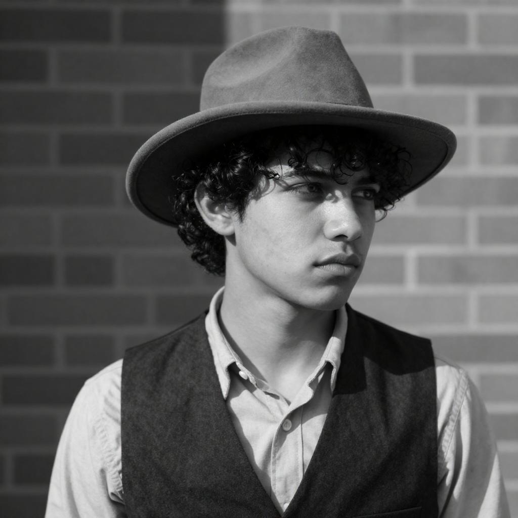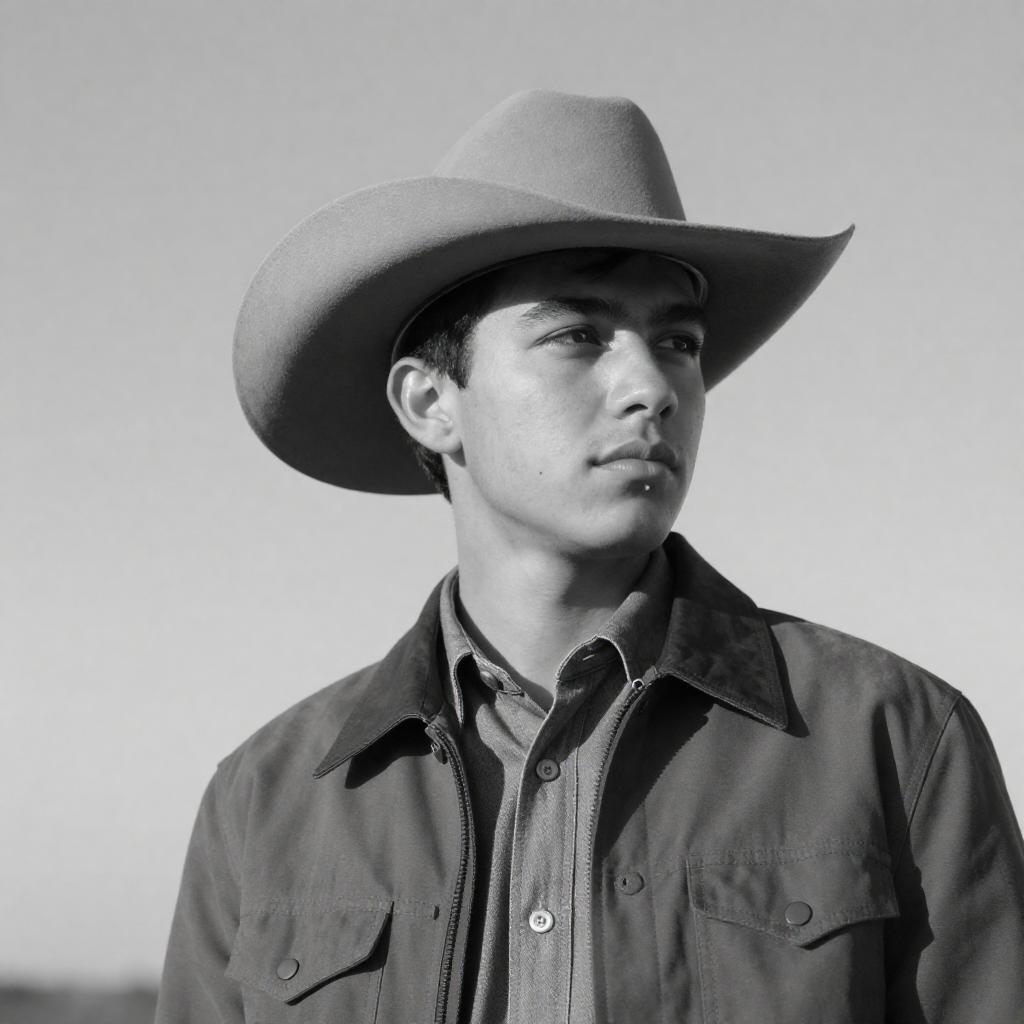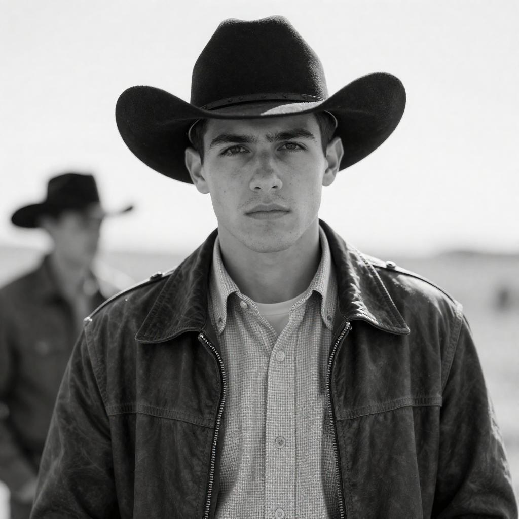 Black and white portrait of a young man with light skin wearing a cowboy hat, a collared shirt, and a rugged jacket. The man has short dark hair and a clean-shaven face, looking slightly to the right with a neutral expression. The background features a simple, light-colored sky, emphasizing the subject.