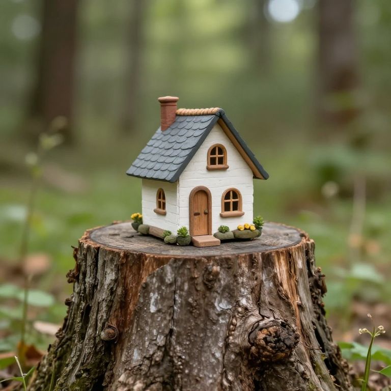 A whimsical gnome-sized house perched atop a massive tree stump defies scale and expectation, creating a charmingly surreal scene where the miniature world seamlessly blends with the natural landscape.