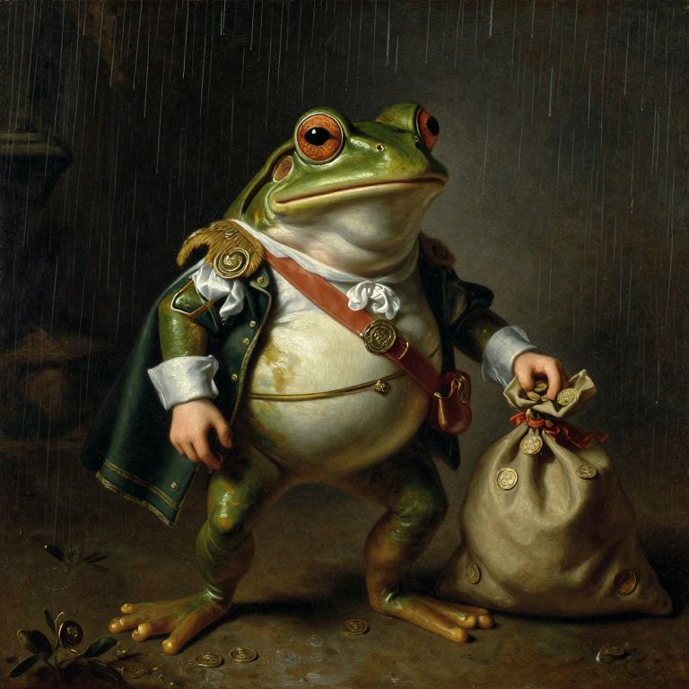 Backlight portrait of a frog as a musketeer, oil painting, Simon Vouet style, it is raining very hard, he is holding a bag of cold coins,