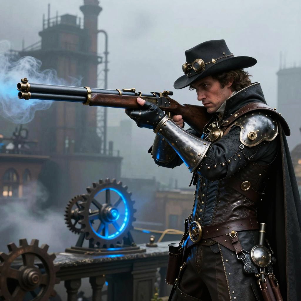Steampunk gunslinger aiming a large, ornate steam-powered rifle, detailed mechanical components, Victorian gothic attire with metal gauntlets and a flowing cape, backdrop of a foggy urban industrial skyline, enhanced with glowing blue steam and gears spinning