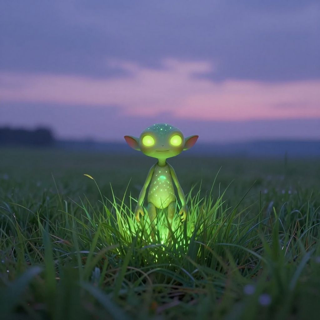 Photograph of a glowing, neon-green, elf-like creature with bright yellow eyes standing in tall grass at twilight, under a purple and blue sky.