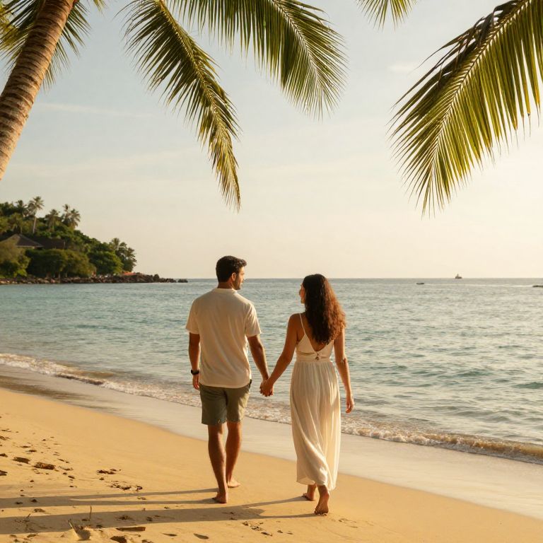 Embracing the timeless embrace of love, two souls walk hand-in-hand along the golden shores of Phuket, where the whispers of the ocean and the rustle of tropical leaves weave a symphony of serenity and boundless hope.