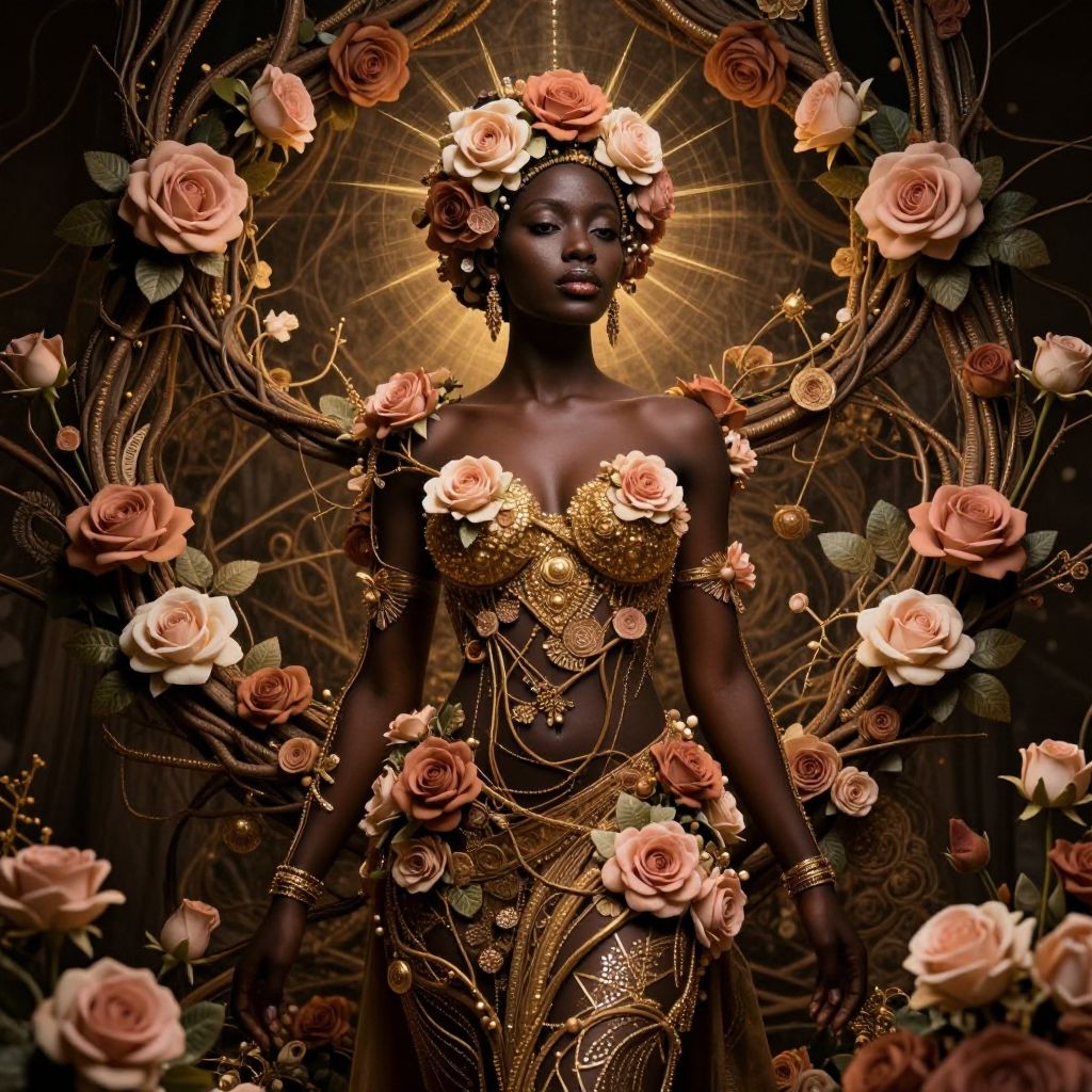 Photograph of a dark-skinned African woman with a radiant glow, standing amidst a circle of large, peach-colored roses. She wears an elaborate golden and floral dress adorned with intricate patterns and roses, and a matching floral crown. Her eyes are closed, and her expression is serene. Golden rays emanate from behind her head, contrasting with the dark, ornate background. The image has a surreal, magical quality, blending elements of traditional African aesthetics with fantasy art styles. The textures of her dress and the roses are highly detailed, enhancing the visual richness.
