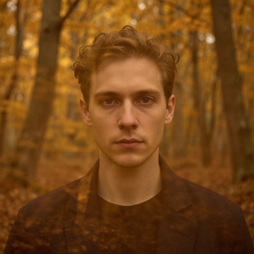 Photograph of a young, fair-skinned man with curly brown hair, wearing a dark shirt, standing in an autumn forest with orange leaves and blurred
