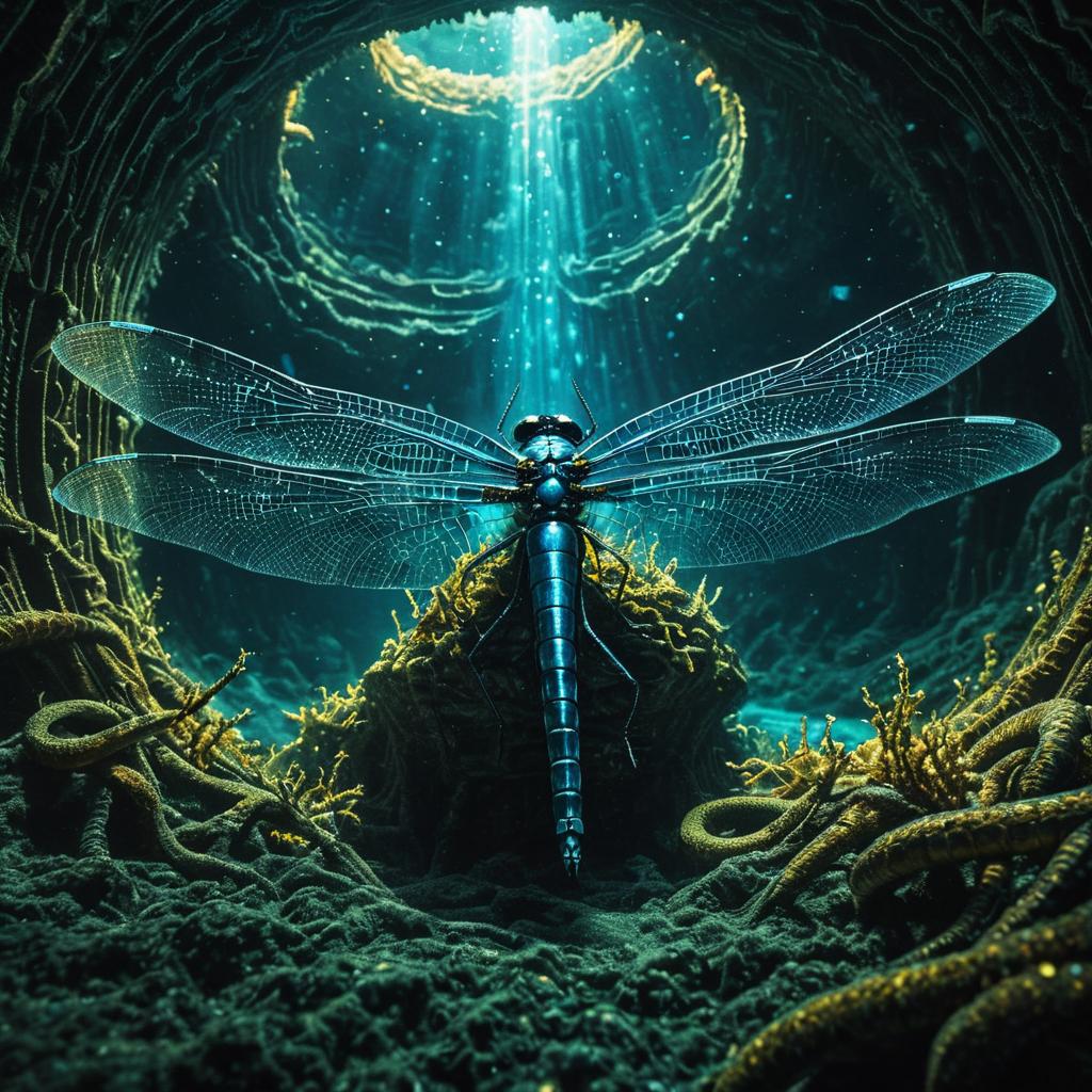 A crystalline dragonfly-serpent hybrid emerges from the glowing underwater cave labyrinth, envisioned in the style of Zdzisław Beksiński and H.R. Giger, captured with a macro lens, shallow depth of field, ultra-detailed digital painting, cinematic lighting, photorealistic, epic Octane render.