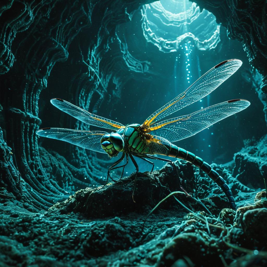 Crystalline Dragonfly-Serpent Hybrid in Underwater Cave