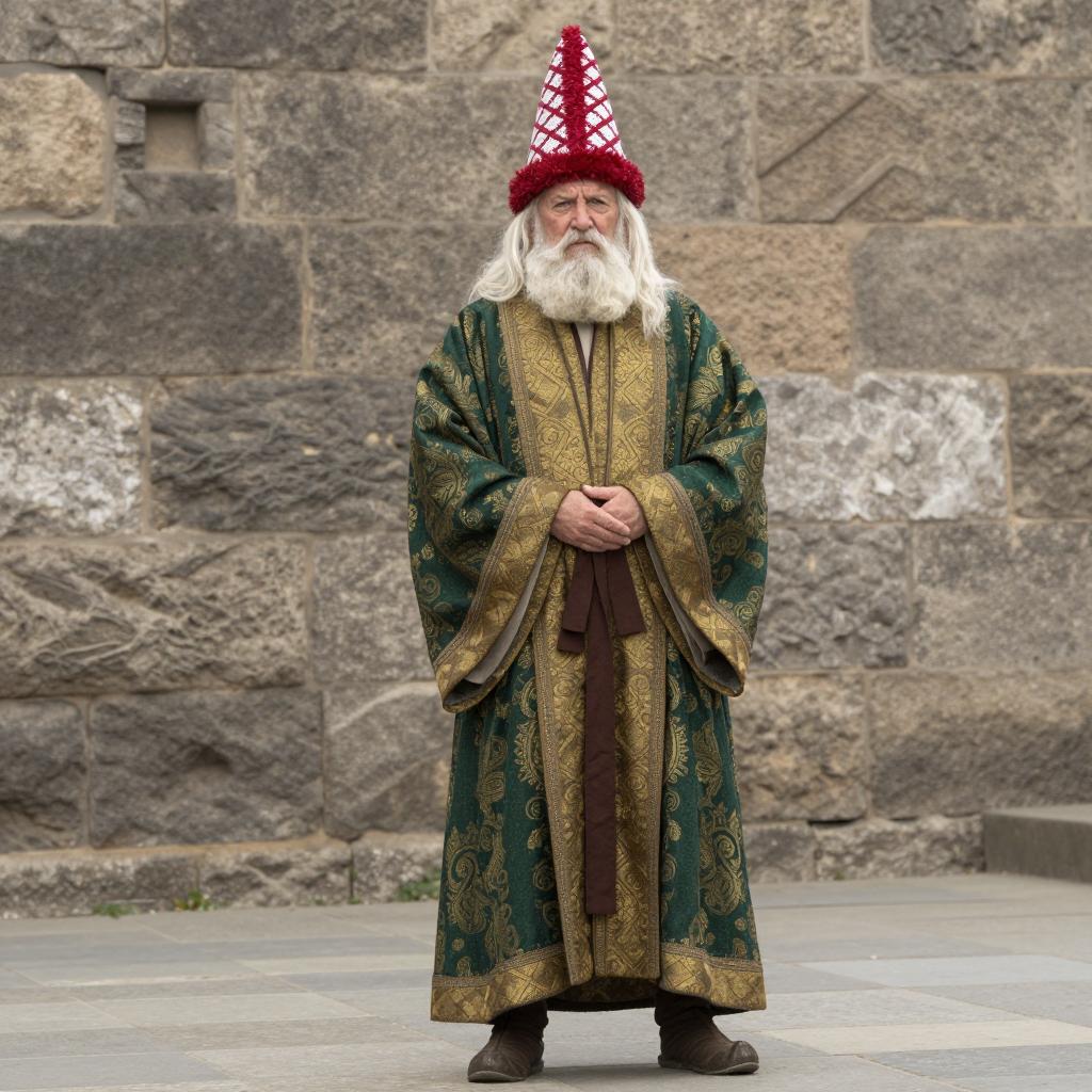 Costume grandpa, photograph of an elderly man with a long white beard, wearing a tall red and white patterned hat, green and gold robe with intricate patterns, standing in front of a stone wall, hands clasped in front, medieval style, daytime, realistic lighting, stone pavement, detailed ures on robe and hat, serious expression, historical attire, full body, front view, realistic photography style