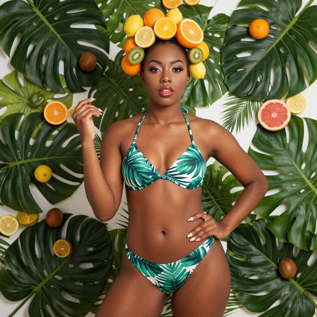 Portrait of a confident African American woman wearing a tropical leaf patterned bikini and a headpiece made of various fresh citrus fruits including oranges, lemons, kiwis, and grapefruit. She is posed against a backdrop of large green tropical leaves with scattered whole and halved fruits, creating a vibrant and colorful tropical theme.