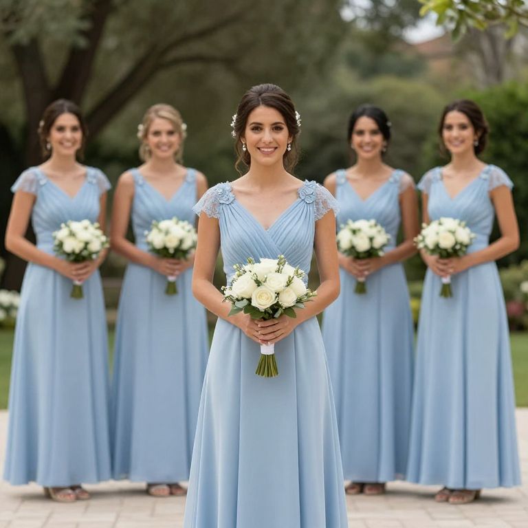 Photograph of a wedding scene featuring a group of five young women standing outdoors in a garden. At the center is the bride, with medium-length dark brown hair in an updo, wearing a light blue, floor-length gown with sheer cap sleeves and a V-neck. She holds a bouquet of white roses. The four bridesmaids, also in light blue dresses with short sleeves, stand in a row behind her, each holding similar white rose bouquets. The background shows blurred greenery and trees, creating a serene, natural setting. The women are smiling, and the overall atmosphere is joyful and elegant.