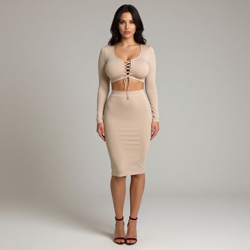 "Woman, sexy, nude two-piece bodycon attire comprising a crop top with long sleeves and center front tie-up detail and a high-waisted midi skirt with a curve-hugging fit; accessorized with burgundy strappy high heels.. Sexy. Pretty face and beаutiful eyes. Big breasts."