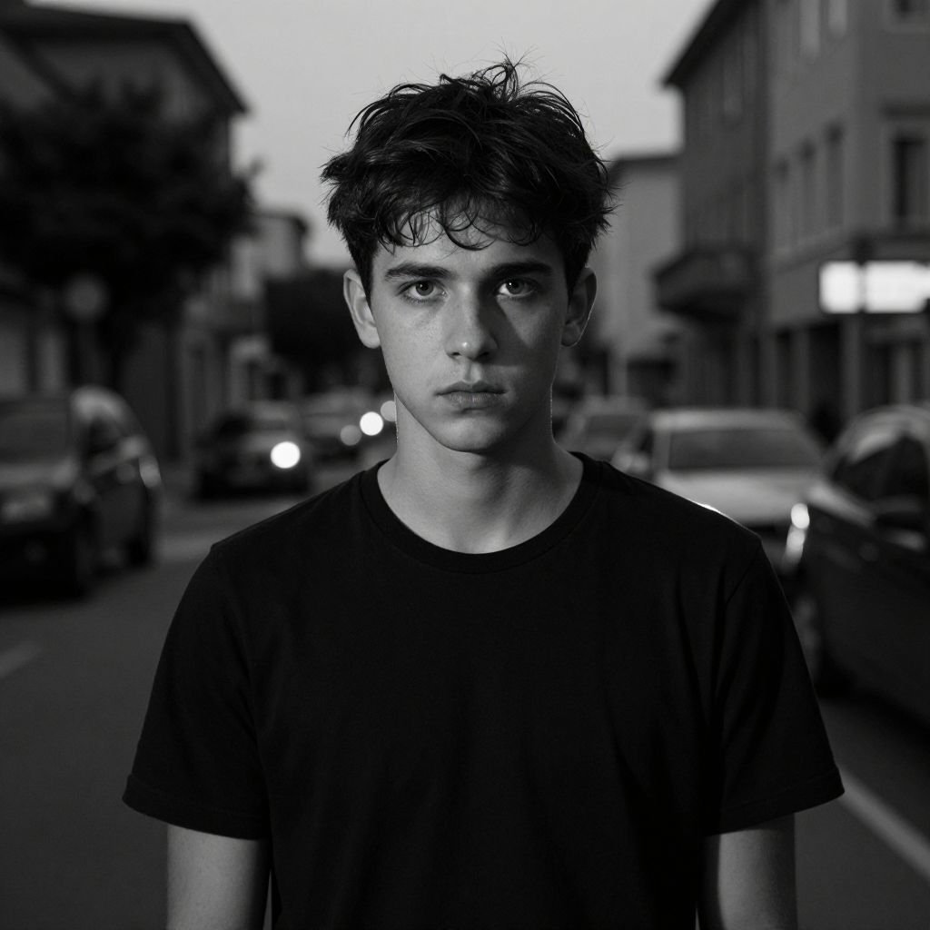 A high-contrast black and white photograph of a young man with short, dark, slightly messy hair standing in an urban street at dusk. He's wearing a plain black t-shirt and has a serious expression. The background is blurred with indistinct buildings and parked cars, creating a moody, dramatic atmosphere. His eyes are strikingly sharp against the dark surroundings.