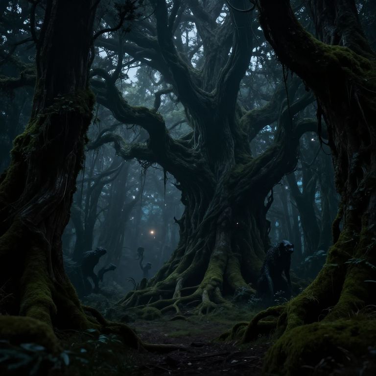 Dark fantasy forest scene at twilight, with gigantic gnarled trees covered in thick moss, dark magical creatures lurking between shadows, faint eerie lights floating in the air, fantasy gothic style, intricate textures and moody lighting