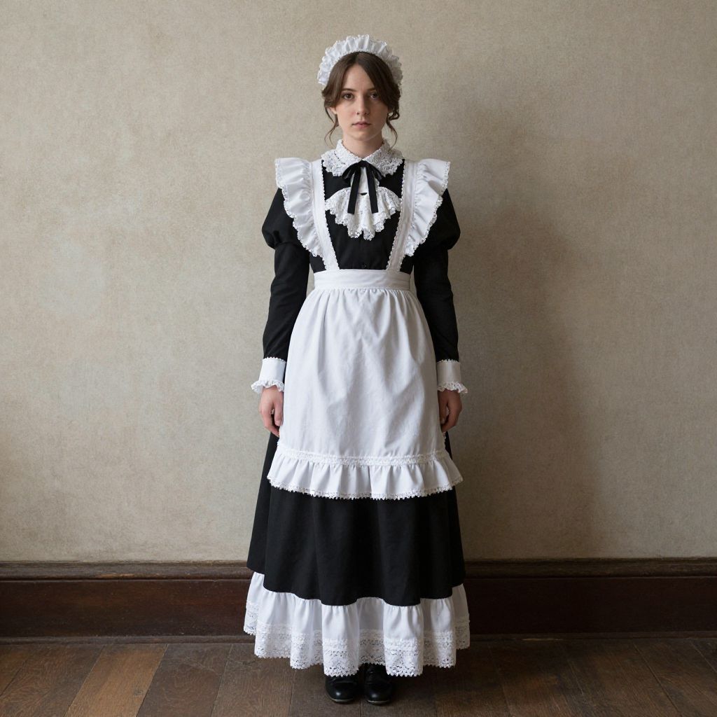 "Victorian French Maid, woman in a black and white dress standing in front of a wall"