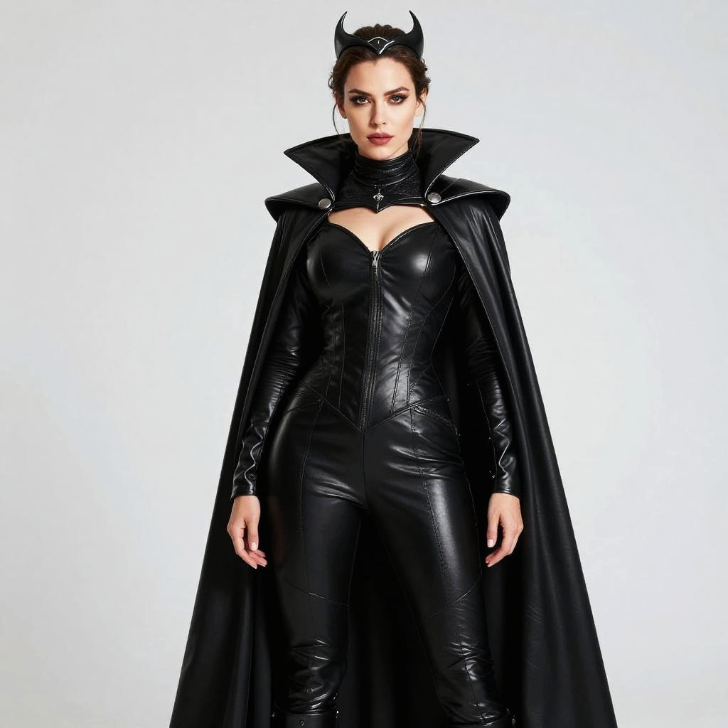 The image features a woman in a striking, artistic costume resembling Marvel Comics' character Selene Gallio, also known as the Black Queen. She is dressed in a form-fitting black leather outfit with a high collar and dramatic cape, embodying a stylish, formidable presence.