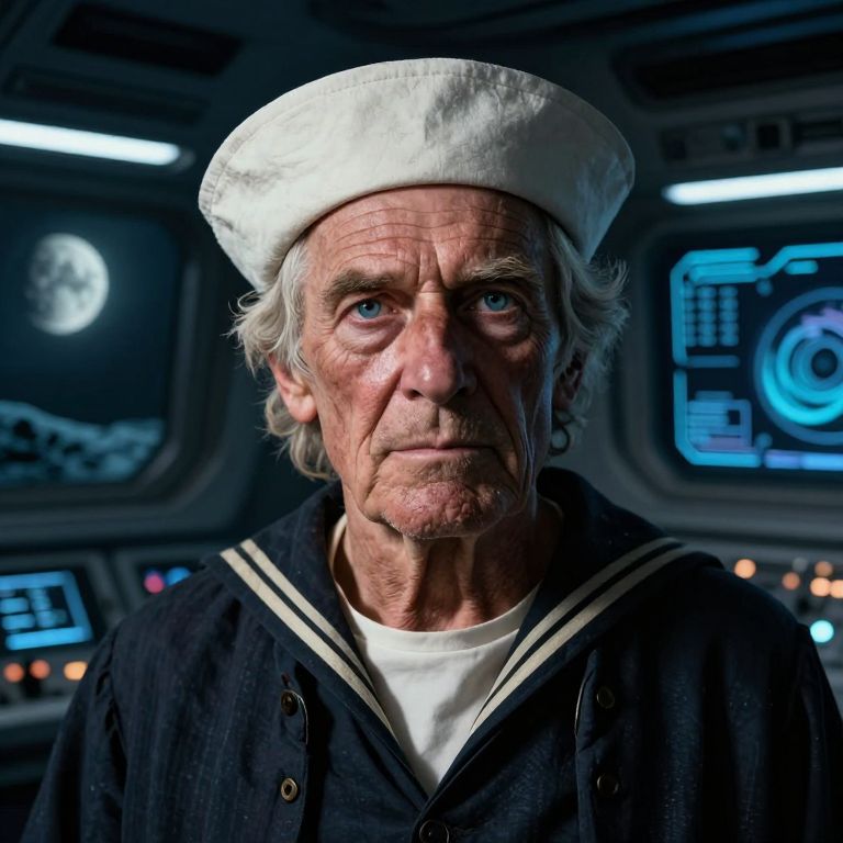 Create a hyperrealistic portrait of an old-fashioned sailor with compassionate blue eyes and a face weathered by years of navigating treacherous seas under harsh suns and alien moons. Place this sailor in an unexpected setting: the dimly lit bridge of a high-tech spaceship, where advanced holographic displays and sleek control panels contrast starkly with his aged appearance. Utilize dramatic lighting to cast deep shadows on his rugged skin while illuminating his intense, wise gaze directed towards the viewer, creating an air of mystery and timeless wisdom.