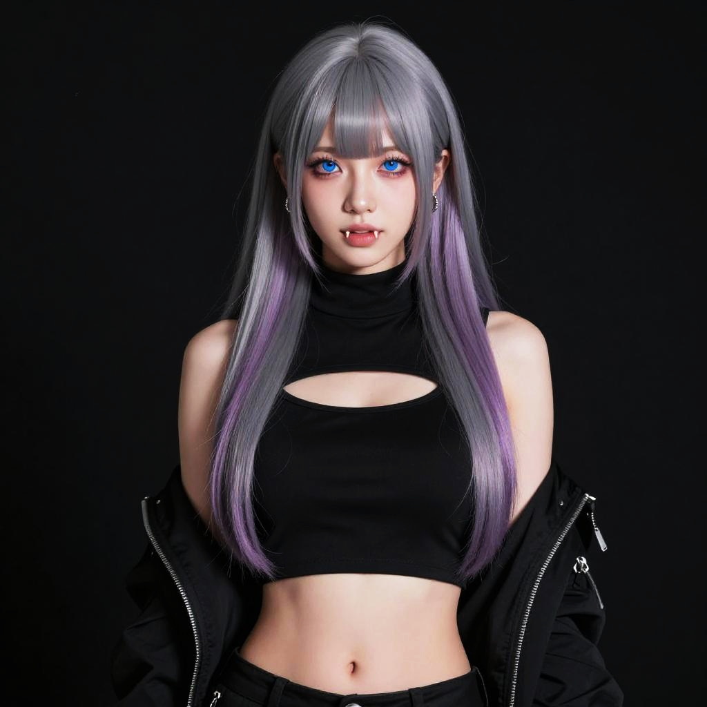 Masterpiece, (photorealistic:1.4), best quality, beautiful lighting, professional lighting, photon mapping, radiosity, physically-based renderingnanakusa nazuna, 1girl, bangs, black background, black jacket, black shirt, black shorts, blue eyes, blunt bangs, breasts, cleavage cutout, clothing cutout, crop top, eyeshadow, fangs, gradient hair, grey hair, hair rings, jacket, light purple hair, looking at viewer, makeup, multicolored hair, navel, open mouth, red eyeshadow, shirt, shorts, sleeveless, sleeveless turtleneck, sleeveless turtleneck crop top, small breasts, solo, stomach, turtleneck, turtleneck crop top, two-tone hair, 8k uhd, film grain